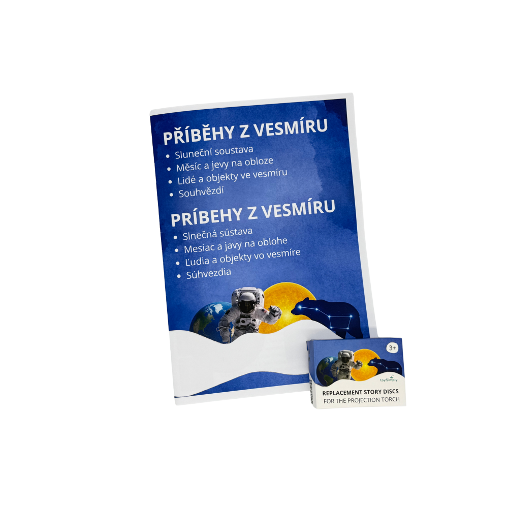 Rozšiřte svět promítací baterky Toysimply o napínavé a poučné vesmírné příběhy! Sada Disketky „Příběhy z vesmíru“ obsahuje čtyři edukativní příběhy, každý s 8 barevnými obrázky, které se promítají na zeď nebo strop – ideální večerní aktivita pro děti, které chtějí poznávat vesmír zábavnou formou.